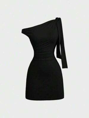 Women’s Black One Shoulder Bodycon Mini Dress – Ruched Slim Fit Party Dress with Side Tie