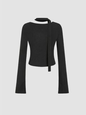 Long-Sleeve Black Top With Contrast White Oversized Bow