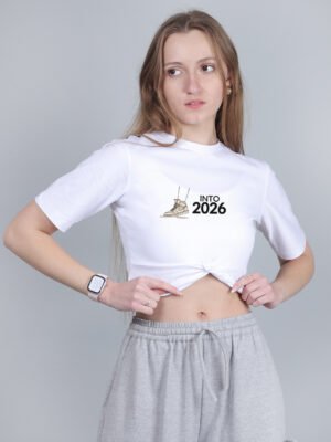 “Into 2026” Graphic Knot-Front Crop Tee – White