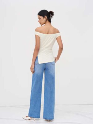 Women’s Off-Shoulder Asymmetrical Ribbed Top – Elegant Cream Side-Tie Blouse