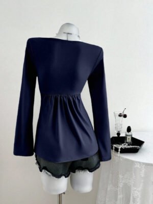 Navy Blue Sweetheart Neck Ruched Top with Flare Sleeves