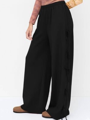 Terry Mid Rise Bowknot Elastic Waist Wide Leg Trousers