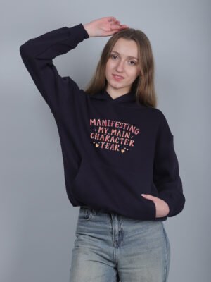 Manifesting My Main Character Year – Navy Blue Oversized Graphic Hoodie