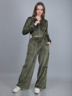 Olive Green Velour Hooded Crop Jacket & Wide Leg Pants Co-Ord Set